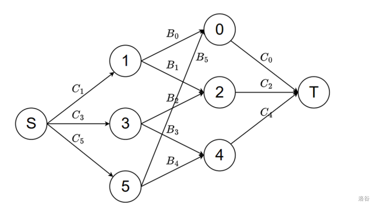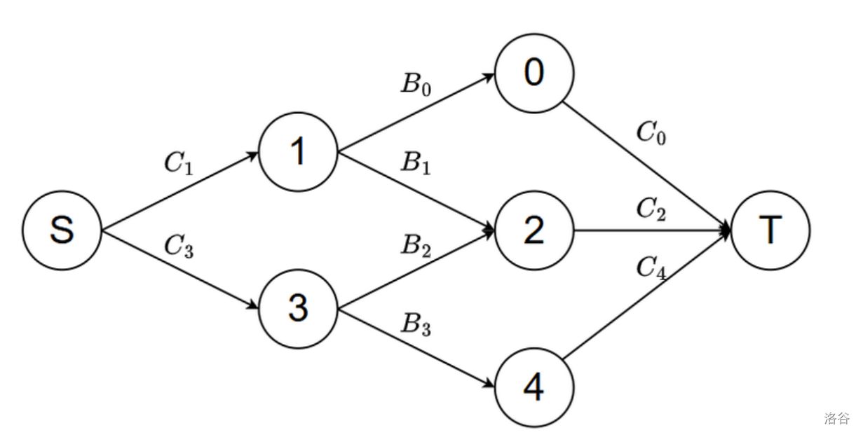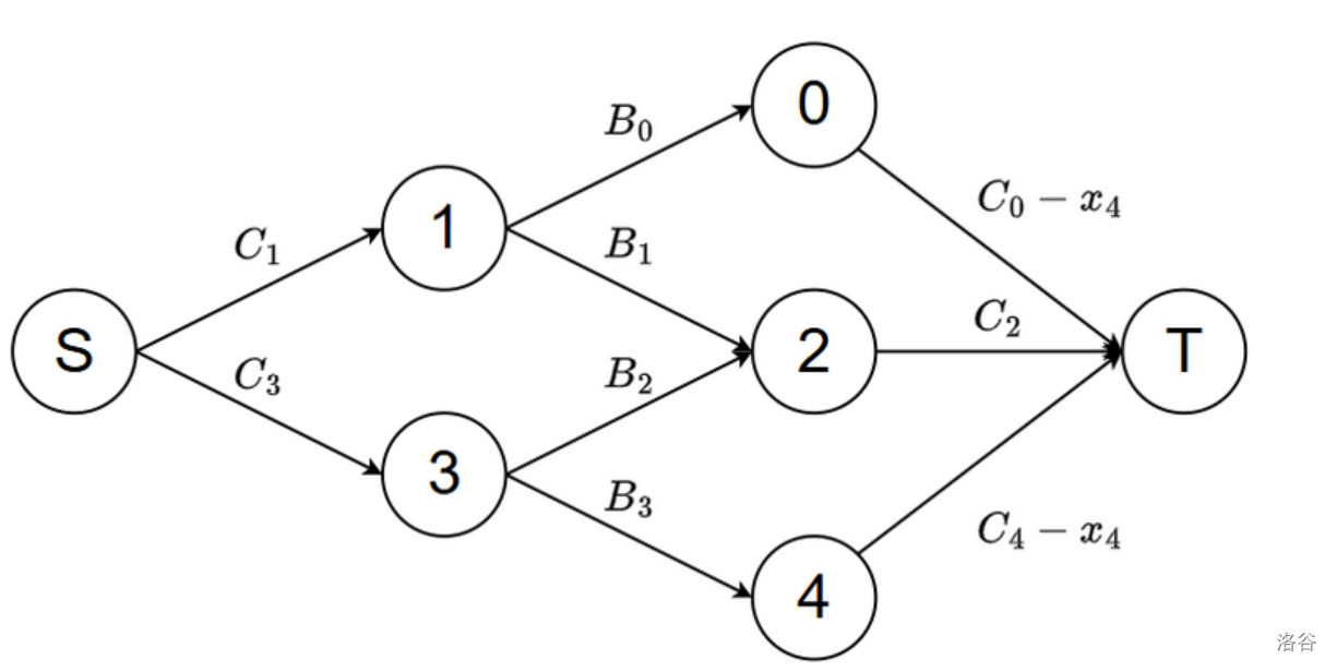 现在我们仍然考虑建出一个和上面一样的网络流,这里以 \(M=5\) 为例: